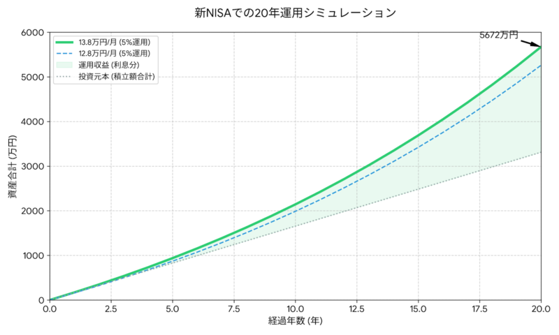 - 太い緑のライン: 月12.8万(節約)+月1万(自分業)=13.8万円を5%で運用:約5,672万円